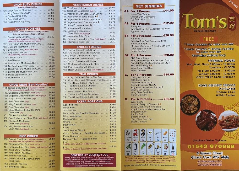 Located in the heart of Chasetown, Toms Chinese Take Away has become a cornerstone of the community, beloved for its casual atmosphere and outstanding service. The establishment is wheelchair accessible, ensuring everyone can enjoy a delicious meal. With a variety of dining options, including takeaway, delivery, and dine-in, Toms caters to the busy lifestyles of Burntwood residents. The restaurant accepts reservations, making it a suitable choice for celebratory dinners or family gatherings. Free street parking and a dedicated parking lot make it easy to swing by even during busy hours. Open every day of the week, Toms ensures that you can enjoy Chinese food whenever the craving strikes. The commitment to quality is evident from the get-go, with a perfect 5-star rating from the Food Standards Agency. The consistency of service and taste has cultivated a loyal following, with patrons often returning after their first experience. The welcoming environment coupled with the tantalizing aromas wafting through the air creates an inviting space perfect for casual family dinners or late-night food runs. Whether you're a local or just passing through, a visit to Toms adds a hearty touch to your culinary adventures.